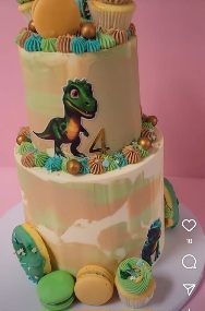 Verras een kind met deze vrolijke dinosaurustaart. De taart is prachtig afgewerkt in zachte pastelkleuren. Hierdoor krijgt jouw feestje meteen een speelse en feestelijke uitstraling. De dino-decoraties, macarons en gekleurde toefjes maken de taart extra bijzonder. Daardoor past deze taart perfect bij een verjaardag of dino-themafeest.