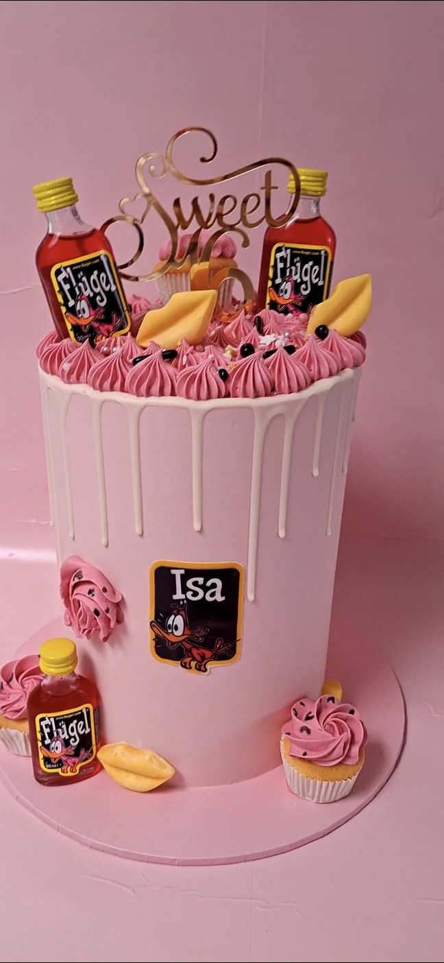 Onze meesterbakkers hebben met zorg een sublieme vanille cake gecreëerd, waarvan elke kruimel doordrenkt is met de rijke, warme tonen van vanille. Maar wat deze Dripcake echt onderscheidt, is de verrukkelijke toevoeging van Flügel. De likeur voegt niet alleen een vleugje pit toe, maar creëert ook een harmonie van smaken die de zintuigen betovert. Elke hap is een reis naar een wereld van zoete weelde en verrassende tintelingen.