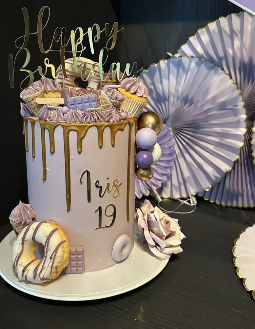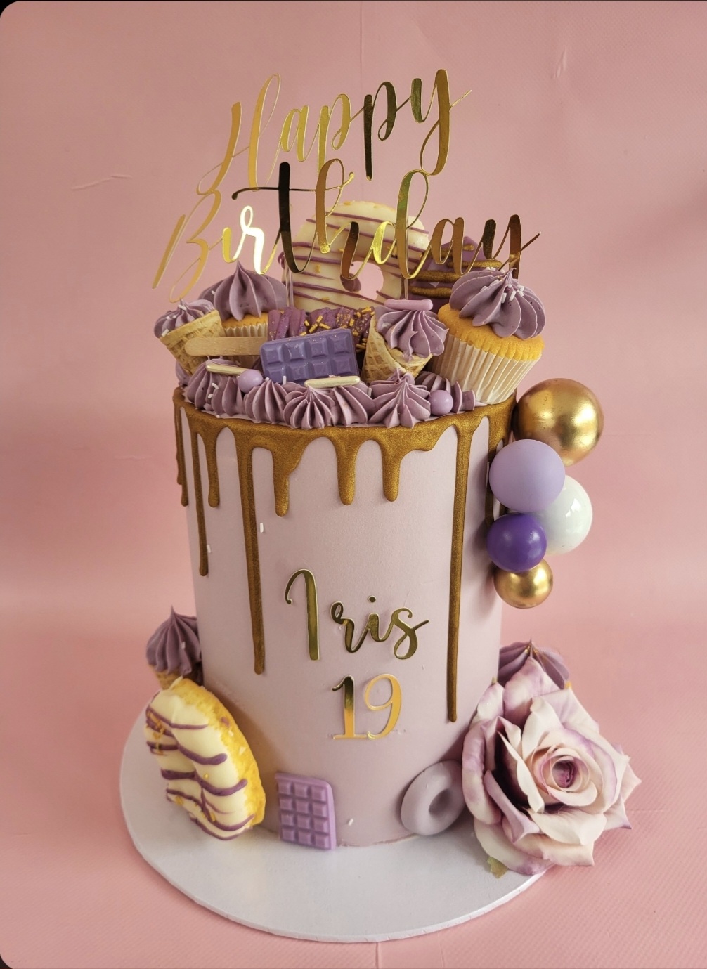 De taart is afgewerkt met een luxe gouden drip en gedecoreerd met bijpassende sweets zoals cupcakes, chocolade en decoratieve details in lila en goud. Bovenop de taart kan een gepersonaliseerde topper geplaatst worden met jouw gewenste tekst.